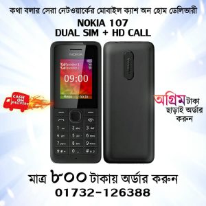 নোকিয়া ১০৭ দুই সিমের মোবাইল এবং প্রতিদিন রাফ ব্যবহার এর জন্য খুব ভাল একটি মোবাইল এটি। Nokia 107 মোবাইল ক্যান্ডিতে অর্ডার করলেই পাচ্ছেন সারা দেশে সর্বোচ্চ তিন দিনের মধ্য ক্যাশ অন হোম ডেলিভারী।